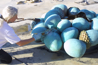 Ceramic slurry coating the castings of the acorns before and after pouring bronze.